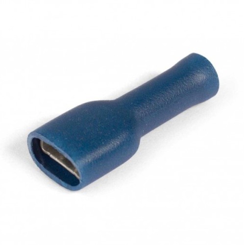 РППИ-М – это плоский полностью изолированный разъем тип «мама» от электротехнического завода КВТ, который представляет собой электромонтажное изделие в изолирующем корпусе синего цвета, сделанного из самозатухающего ПВХ. Оно служит для формирования быстроразъемных изолированных соединений многопроволочных медных проводов с наконечниками или клеммными выходами электрооборудования типа «папа». Термостойкость изоляции достигает 75 градусов Цельсия. Ширина клеммы РПИ-П для этого разъема составляет 5.1 мм. Его параметры: 4.8х0.8 мм. Сам разъем выполнен из латуни марки Л63, покрытый методом электролитического лужения. Его общая длина – 20.2 мм, допустимое сечение проводов от 1.5 до 2.5 квмм. Плоский разъем рассчитан на номинальный ток в 15 Ампер и максимальное напряжение сети 400 Вольт. Благодаря полной интеграции разъема в изолированный корпус обеспечивается механическая защита и изоляция разъемного соединения. Наличие поперечных засечек на внутренней поверхности трубной части разъема увеличивает механическую прочность соединения с жилой. Клемма имеет конструктивный фиксатор замкового типа для прочного механического крепления с разъемом «папа». Поставляется изделие комплектом в количестве 100 единиц.