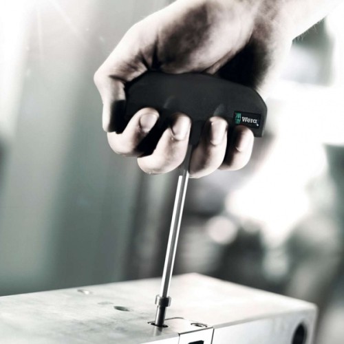 Шестигранная отвертка с поперечной ручкой производителя Wera серии 454 предназначена для работы с внутренними шестигранниками. Профиль Hex-Plus увеличивает площадь контакта с головкой винта. За счет этого до минимума снижается концентрация напряжения в профиле, что практически исключает вероятность разрушения головки винта. Размер наконечника равен 2,0 мм, длина стержня составляет 100 мм. Ширина ручки – 61 мм, длина ручки – 27 мм. Идеальная эргономичная форма ручки делает возможным получение больших моментов силы при затяжке и отпуске винтов. Она повторяет форму ладони, пальцы ложатся в округлые выемки. Вся рука получает контакт с ручкой, таким образом, не теряется сцепление между ладонью и ручкой. Благодаря положению руки, при котором ось отвертки является ее продолжением, достигаются особенно большие моменты силы. Рабочий конец шестигранной отвертки изготовлен из специальной легированной стали и обеспечивает ее высокую износостойкость и прочность. Гарантийный срок службы инструмента равен 2 года.