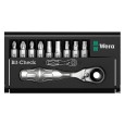 Компактный набор инструментов фирмы Wera серии Zyklop Mini 1 Bit-Check+ Bit Ratsche 9 SB состоит из 10 предметов и включает в себя ключ-трещотку Zyklop Mini 1 и 9 бит. Трещотка имеет кованую стальную конструкцию и подходит для насадок с шестигранным хвостовиком 1/4 дюйма. Тонкий механизм зацепления на 60 зубцов обеспечивает малый угол возврата на 6 градусов для точной работы. Трещотка имеет простое переключение реверса. Для высокой скорости работы имеется ребристый диск, с помощью которого можно значительно ускорить завинчивание, поскольку сама ручка-трещотка для битов вступает в работу только при завершающей затяжке винта трещоткой. Небольшие по высоте габариты ключа идеально подходят для использования инструмента в узком пространстве. Биты PH, PZ, TX, Hex-Plus закалены до вязкой прочности и идеально подходят для завинчивания с нагрузкой, например, в металлические листы или металл. Все изделия в наборе оснащены цветовой маркировкой профиля и гравировкой размеров. На набор инструментов действует официальная гарантия производителя сроком на 2 года.