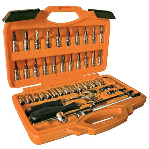 Трещотка 1/4”, отвертка-вороток 150 мм, вороток 1/4”, три удлинителя жала 1/4” (50, 100 и 130 мм), гибкий вал 1/4” 150 мм, карданный шарнир 1/4”, 13 торцевых головок 1/4” (4;4,5;5;5,5;6;7;8; 9;10; 11;12;13;14 мм), набор шестигранных ключей «HEX» (4 шт.), 21 торцевая головка 1/4” (PH1, PH2, PH3, PZ1, PZ2, PZ3, HEX: 3, 4, 5, 6, 7, 8 мм; TORX: T10, T15, T20, T25, T30, T40; SL 4, 5,5, 7 мм), пластиковый чемодан.