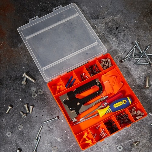 Имеет одно длинное отделение и 10 отделений для мелочей, предназначен для хранения различных мелочей, замок плотно фиксирует крышку, что обеспечивает сохранностьвещей при транспортировкке, прозрачная крышка создет дополнительные удобства при хранении, компактен, эргономичен, функционален.
