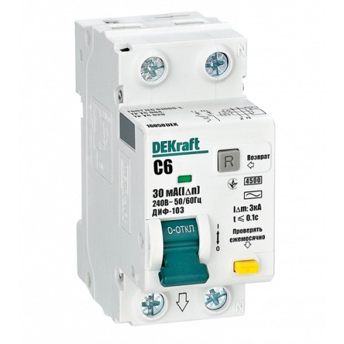 Автоматический выключатель дифферинциального тока двухполюсный на два модуля с током утечки 30мА, током нагрузки 6А, током КЗ 4.5кА, характеристикой С, Декрафт ДИФ-103.