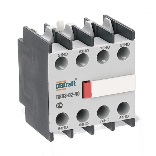 Приставка контактная серии ПК-03-02 для контакторов КМ-103 DEKraft; кол-во контактов - 4НО; ном.ток – 10 А; ном.напряжение – до 690 В; установка – с лицевой стороны; степень защиты – IP20. Приставки контактные предназначены для увеличения количества вспомогательных контактов контактора. Контактные приставки механически соединяются с контакторами и фиксируются при помощи защелки. Приставка подходит для использования с контакторами других производителей.