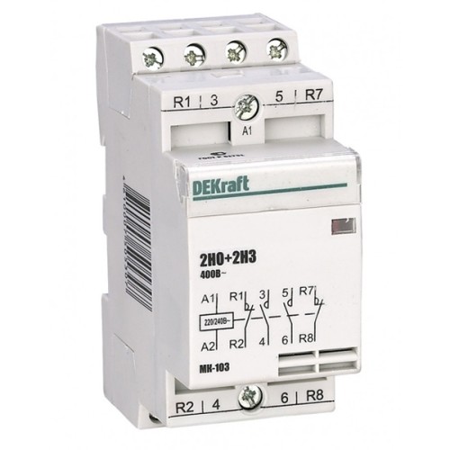 Модульный контактор серии МК-103 DEKraft; ном.ток 20 А (АС-7а); кол-во и исполнение контактов – 2НО+2НЗ; напряжение управления 220 В пер.тока; ширина – 2 мод. х 18 мм; установка – на DIN-рейку. Контакторы МК-103 применяются в сетях напряжением до 400 В пер.тока для дистанционного управления небольшими нагрузками, требующими большого количества включений / отключений, например, насосы, системы вентиляции и т.п. Модульные контакторы не требуют дополнительных настроек и специального обслуживания.