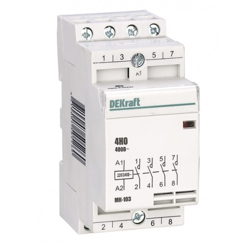 Модульный контактор серии МК-103 DEKraft; ном.ток 16 А (АС-7а); кол-во и исполнение контактов – 4НО; напряжение управления 220 В пер.тока; ширина – 2 мод. х 18 мм; установка – на DIN-рейку. Контакторы МК-103 применяются в сетях напряжением до 400 В пер.тока для дистанционного управления небольшими нагрузками, требующими большого количества включений / отключений, например, насосы, системы вентиляции и т.п. Модульные контакторы не требуют дополнительных настроек и специального обслуживания.