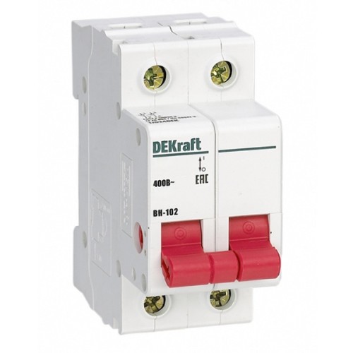 Выключатель-разъединитель серии ВН-102 DEKraft; 2P; номинальный ток 25 А; установка – на DIN-рейку; установочное положение - любое. Выключатели-разъединители применяются для ручного включения/отключения сетей напряжением до 400 В. Специальные мостиковые контакты обеспечивают надежный разрыв цепи; они полностью исключают возможность перекрытия дугой по изоляции. Усиленная рукоятка управления обеспечивает большое количество включений/отключений.