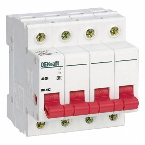 Выключатель-разъединитель серии ВН-102 DEKraft; 4P; номинальный ток 32 А; установка – на DIN-рейку; установочное положение - любое. Выключатели-разъединители применяются для ручного включения/отключения сетей напряжением до 400 В. Специальные мостиковые контакты обеспечивают надежный разрыв цепи; они полностью исключают возможность перекрытия дугой по изоляции. Усиленная рукоятка управления обеспечивает большое количество включений/отключений.