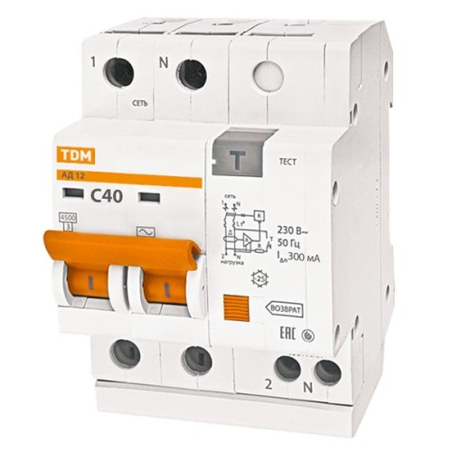 Двухполюсный дифавтомат АД12 ТДМ, номинальный ток 40 ампер, дифференциальный ток 300 мА, ширина 3,5 модуля