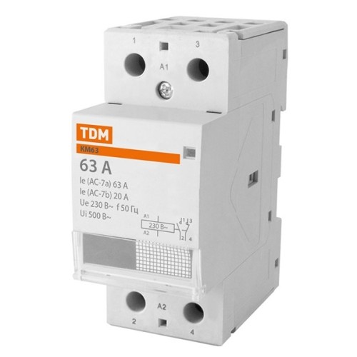 Двухполюсный модульный контактор КМ63 ТДМ, номинальный ток 63 ампера, 1 нормально-открытый контакт; 1 нормально-закрытый контакт