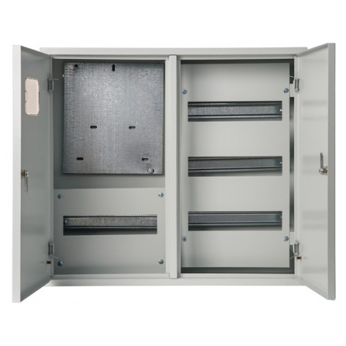 Металлический двухстворчатый навесной учетно-распределительный щит для трехфазного счетчика, 48 модулей с окошком и замком, Декрафт.