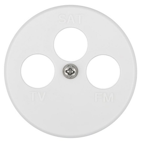 Представленная здесь накладка для телекоммуникационной розетки TV+FM+SAT имеет форму круга с тремя отверстиями, два из которых находятся на горизонтальной оси, а третье завершает вершину равнобедренного треугольника. Каждое отверстие оформляет коннекторный ввод принимающего сигнал устройства и соответственно промаркировано. В центре накладки находится перфорация для винтового крепежа к блоку механизма.