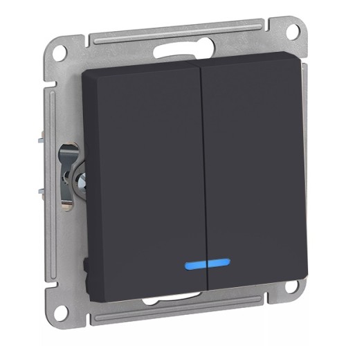 Выключатель с панелью из двух клавиш монтируется в помещениях, где имеется две схемы электрического освещения, которые нужно включать/выключать по отдельности. У данного изделия серии изделий Атлас Дизайн от французской компании Шнайдер Электрик на клавишах имеется диодная подсветка, благодаря которой выключатель можно легко найти в кромешной темноте.
