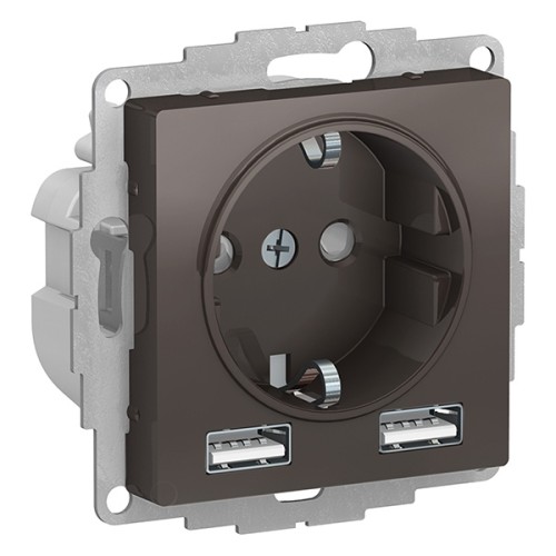Розетка силовая Шнайдер Электрик Атлас Дизайн с заземлением и шторками, два USB разъема, скрытого монтажа, цвет мокко