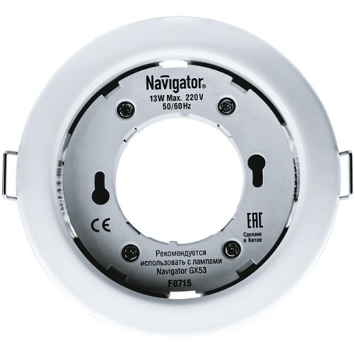 Встраиваемые светильники Navigator серии NGX для ламп с цоколем GX53 – энергосберегающая альтернатива светильникам под галогенную или лампу накаливания. Предназначены для освещения жилых и общественных помещений: гостиниц, магазинов, банков, лестниц, лифтов и т.п. Идеально подходят для подвесных и натяжных потолков, мебели и других конструкций.